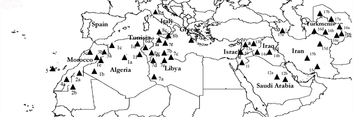 ![]() ▲ reported presence of Calosoma (Campalita) algiricum Algeria: 1a - El Golea (RMCA); 1b - Erg Iguidi (Breuning, 1927: 219); 1c - Sebdou (Breuning, 1927: 219); 1d - Ain Oumach, near Biskra (Breuning, 1927: 219); 1e - W. Béchar, Beni Abbès (AVT); 1f - Touggourt (type, MNHN); Mauritania: 2a - Ain Ben Tili (Antoine, 1955: 24); 2b - Zouérat (SB); Morocco: 3a - E. Bouarfa, 320km SE Féz (SB); 3b - H. Atlas, Tafilalt (AVT); 3c - Meknès, 34 km W Erfoud (SB); Western Sahara: 4 - Rio de Oro (Antoine, 1955: 24); Smamit (RMCA); Canary Islands (Spain): 5 - La Gomera (on sale in 2009); Tunisia: 6a - Tataouine (SB) ; 6b - Tozeur (SB; EM), Gafsa, Metlaoui (MG), Mides (Breuning, 1927: 219); Libya: 7a - Fazzan, Tikiumit NW of Al Awainat (http://jcringenbach.free.fr/); 7b - Tripoli (NMP), Tarabalus, Jādū (SB); 7c - Taworgha (AVT, RMCA); Ghot Sultan (AVT); 7d - Ghadames (SB), South of Dirj; Sinauen (EM, SB) 7e - Al Mardum (Bani Whalid) (http://www.insecte.org/); Malta: 7f - Gozo: Rabat (Magrini & al, 1997: 218). Italy: 8a - Sicilia: Isola di Linosa, Cava Pozzolana di Ponente (AVT), Isola di Lampedusa (Vigna Taglianti, 1995); 8b - Siracusa, Eloro (Casale et al, 1982: 96); 8c - Trapani, Castelvetrano (Monastra, 1984); 8d - Toscana, Grosseto (Bandinelli, 1984: 56); Greece: 9 - Pelopponesos (Franzen, 2006: 60); Israel: 10 - Engedi, Dead Sea (AVT); Jordan: 11 - Wadi Rum (Borzatti von Löwenstern A. 1987: 113); Saudi Arabia: 12a - Buraj dah (SB); 12b - Al-Riyad Thumamah National Park (Mateu, 1990: 39); Syria: 13a - Homs (NMP); 13b - Palmira (NMP); Iraq: 14a - Rutba (Mandl, 1967e: 459); 14b - Ramadi (Mandl, 1967e: 459); Iran: 15a - Eastern Azerbaijan, Arasbaran (Ghahari et al., 2010: 183); 15b - Kerman (Sadeghi et al., 2011: 189); 15c - Bandar Abbas (EM); 15d - Kanadj (SB); Turkmenistan: 16a - Repetek ( S Turkmenabad); 16b - Ljutfabad (Lotfabad) (Breuning, 1927: 219), Aşgabat (Askhabad) (Jeannel, 1940: 114); 16c - Dortkuju (W Merv); 16d - Kopet Dagh, Kara-Kala (AVT); 16e - Mary reg. Utsch Adshi (type of petri, Breuning, 1927: 219); Uzbekistan: 17a - Khorezm reg., (Khamraev, 2003: 47); 17b - Karakapakstan reg. (Khamraev, 2003: 47); |