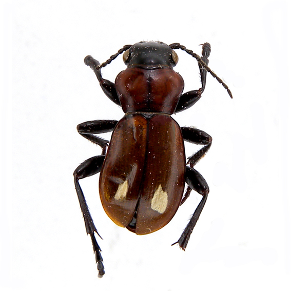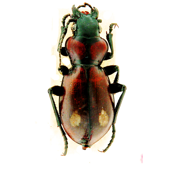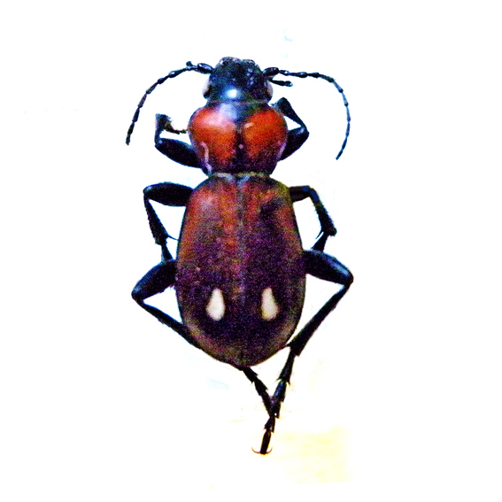 C. volkensi is characterized by the pronotum only moderately transverse, posteriorly narrow and weakly sinuata. The elytra are smooth without visible sculpture, widened in the posterior third. The upper body is yellowish brown to blackish, with a very characteristic large white spot in the back half of each elytron.